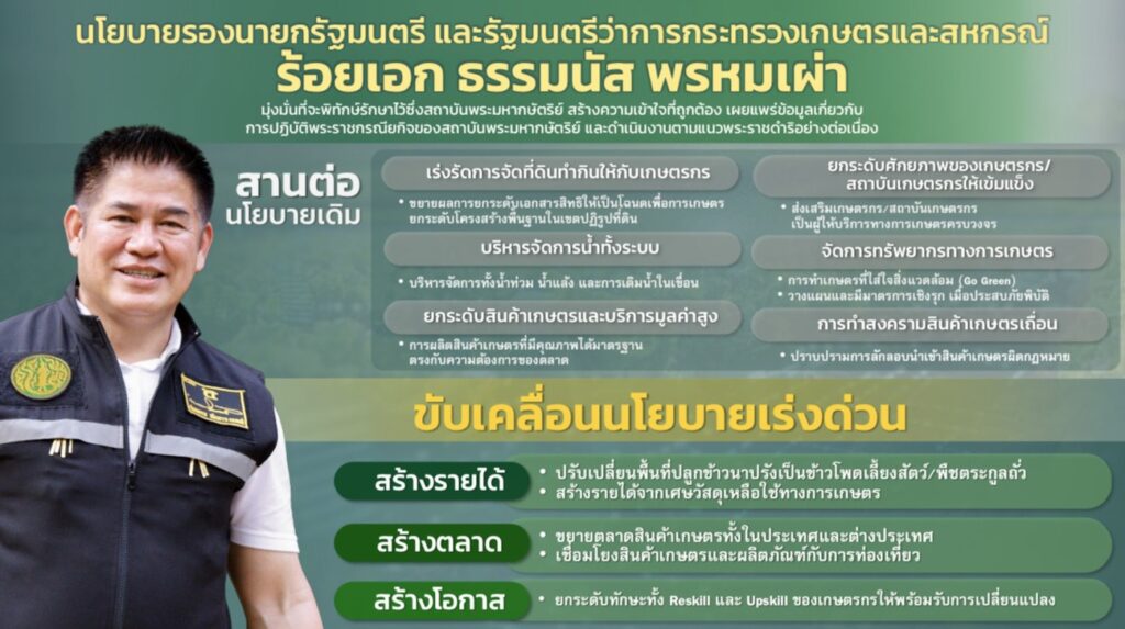 ทั้งนี้ รองนายกรัฐมนตรี และรัฐมนตรีว่าการกระทรวงเกษตรและสหกรณ์ ได้เน้นย้ำถึงหลักการทำงานสำคัญ คือการมุ่งมั่นพิทักษ์รักษาไว้ซึ่งสถาบันพระมหากษัตริย์ สร้างความเข้าใจที่ถูกต้อง เผยแพร่ข้อมูลเกี่ยวกับการปฏิบัติพระราชกรณียกิจของสถาบันพระมหากษัตริย์ และดำเนินงานตามแนวพระราชดำริอย่างต่อเนื่อง โดยมุ่งเน้นการสืบสาน รักษา และต่อยอด ควบคู่ไปกับการสานต่อนโยบายเดิม 9 นโยบาย พร้อมทั้ง ขับเคลื่อนนโยบายเร่งด่วน “ สร้างรายได้ สร้างตลาด สร้างโอกาส ” สำหรับด้านการบริหารจัดการน้ำ เน้นย้ำให้บริหารจัดการน้ำอย่างเป็นระบบ ครอบคลุมทั้งการแก้ไขปัญหาน้ำท่วม น้ำแล้ง พร้อมสั่งการให้หน่วยงานวางแผนเชิงรุก เตรียมความพร้อมรับมือภัยพิบัติ ลดผลกระทบต่อภาคเกษตรได้อย่างมีประสิทธิภาพ และพัฒนาคุณภาพชีวิตเกษตรกรให้มีความเป็นอยู่ที่ดีขึ้นอย่างยั่งยืนต่อไป