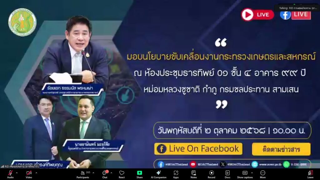 วันพฤหัสบดีที่ 2 ตุลาคม 2568 เวลา 10.00 น. ร้อยเอก ธรรมนัส พรหมเผ่า รองนายกรัฐมนตรี และ รัฐมนตรีว่าการกระทรวงเกษตรและสหกรณ์ เป็นประธาน การประชุมมอบนโยบายขับเคลื่อนงานกระทรวงเกษตรและสหกรณ์ พร้อมด้วย นายอามินทร์ มะยูโซ๊ะ รัฐมนตรีช่วยว่าการกระทรวงเกษตรและสหกรณ์ นายนเรศ ธำรงค์ทิพยคุณ รัฐมนตรีช่วยว่าการกระทรวงเกษตรและสหกรณ์ คณะผู้บริหารกรมชลประทาน ผู้ทรงคุณวุฒิ ผู้อำนวยการสำนัก/กอง ส่วนกลาง และคณะผู้บริหารในสังกัดกระทรวงเกษตรและสหกรณ์ เข้าร่วมประชุมฯ ณ ห้องประชุมธารทิพย์ 01 ชั้น 4 อาคาร 99 ปี หม่อมหลวงชูชาติ กำภู กรมชลประทาน สามเสน กรุงเทพฯ