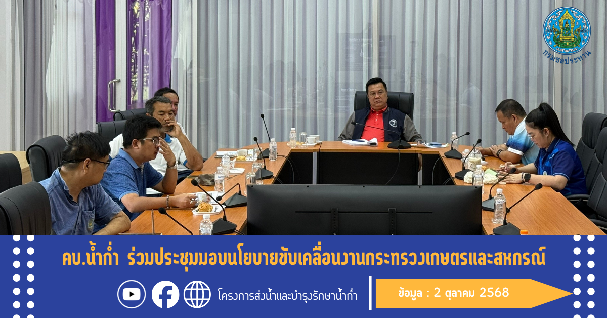 วันพฤหัสบดีที่ 2 ตุลาคม 2568 เวลา 10.00 น. ร้อยเอก ธรรมนัส พรหมเผ่า รองนายกรัฐมนตรี และ รัฐมนตรีว่าการกระทรวงเกษตรและสหกรณ์ เป็นประธาน การประชุมมอบนโยบายขับเคลื่อนงานกระทรวงเกษตรและสหกรณ์ พร้อมด้วย นายอามินทร์ มะยูโซ๊ะ รัฐมนตรีช่วยว่าการกระทรวงเกษตรและสหกรณ์ นายนเรศ ธำรงค์ทิพยคุณ รัฐมนตรีช่วยว่าการกระทรวงเกษตรและสหกรณ์ คณะผู้บริหารกรมชลประทาน ผู้ทรงคุณวุฒิ ผู้อำนวยการสำนัก/กอง ส่วนกลาง และคณะผู้บริหารในสังกัดกระทรวงเกษตรและสหกรณ์ เข้าร่วมประชุมฯ ณ ห้องประชุมธารทิพย์ 01 ชั้น 4 อาคาร 99 ปี หม่อมหลวงชูชาติ กำภู กรมชลประทาน สามเสน กรุงเทพฯ