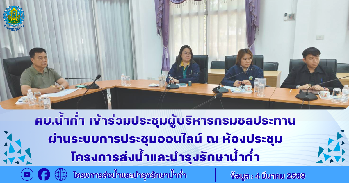 วันที่ 4 มีนาคม 2569 นายวรเทพ วัฒนวิเชียร ผู้อำนวยการโครงการส่งน้ำและบำรุงรักษาน้ำก่ำ พร้อมด้วยหัวหน้าฝ่าย และเจ้าหน้าที่ เข้าร่วมประชุมผู้บริหารกรมชลประทาน ผ่านระบบการประชุมออนไลน์ ณ ห้องประชุมโครงการส่งน้ำและบำรุงรักษาน้ำก่ำ ในการประชุมครั้งนี้ได้มีการรายงานสถานภาพการดำเนินโครงการพระราชดำริ , การติดตามผลการดำเนินงานตามนโยบาย RID UNITED , การเพิ่มประสิทธิภาพการบริหารจัดการน้ำ ,การติดตามเร่งรัดการดำเนินงานและผลการเบิกจ่าย ปี พ.ศ.2569