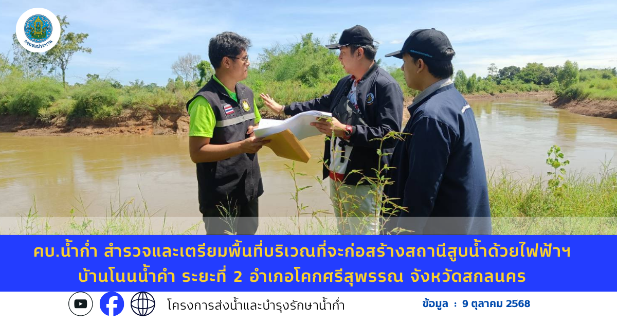 วันที่ 9 ตุลาคม 2568 โครงการส่งน้ำและบำรุงรักษาน้ำก่ำ โดย นายวรเทพ วัฒนวิเชียร ผู้อำนวยการโครงการฯ มอบหมายให้ นายยอดรัก หนึ่งคำมี และเจ้าหน้าที่ ดำเนินการสำรวจและเตรียมพื้นที่บริเวณที่จะก่อสร้างสถานีสูบน้ำด้วยไฟฟ้าฯ บ้านโนนน้ำคำ ระยะที่ 2 อำเภอโคกศรีสุพรรณ จังหวัดสกลนคร ซึ่งได้รับความร่วมมือจากสำนักงานทรัพยากรธรรมชาติและสิ่งแวดล้อมจังหวัดสกลนคร ให้คำแนะนำและข้อมูลเกี่ยวกับมาตรการรองรับสิ่งแวดล้อม